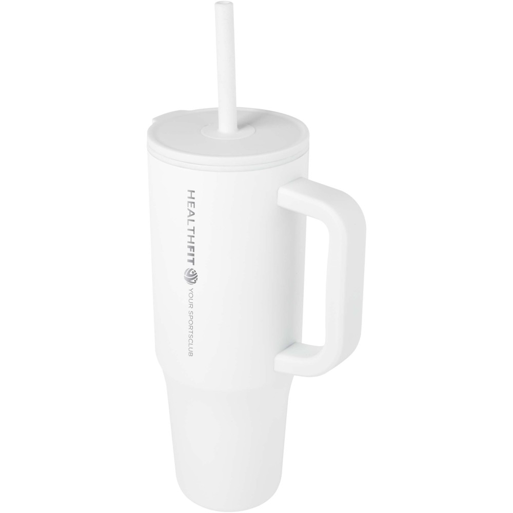 Strapabíró külső fallal rendelkező tumbler, amely RCS tanúsítvánnyal rendelkező újrahasznosított rozsdamentes acélból készült, belső fala pedig műanyag. Beépített, élelmiszeripari szilikon szívószállal és fröccsenésgátló, rányomható tetővel a kényelmes ivás érdekében. Meleg italokhoz is használható, de ezek fogyasztása szívószállal nem ajánlott. A forró italok hűtéséhez javasolt a tető eltávolítása. Űrtartalom: 900 ml. Kézi mosogatás javasolt.