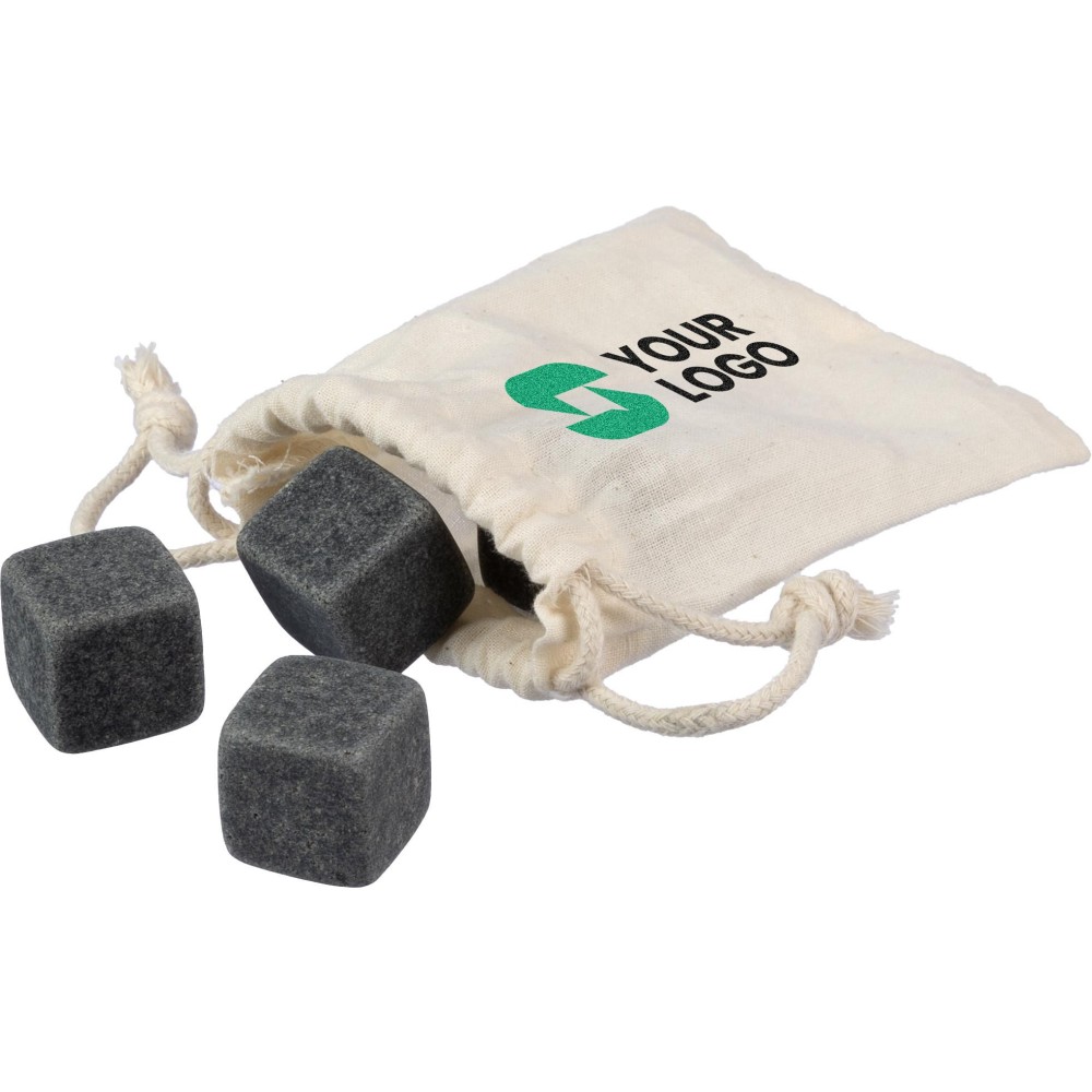 4 db újrafelhasználható természetes kőből álló kockakészlet. A köveket hűtőbe kell tenni, hogy lehűljenek. Pamut zsinóros tasakban csomagolva érkezik.