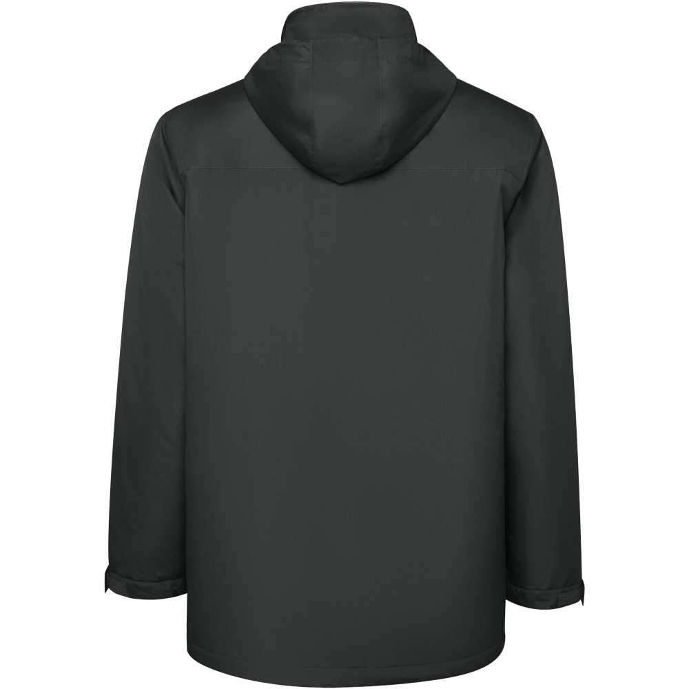 Vízálló bélelt parka férfiaknak. Magas gallérral és levehető kapucnival, tépőzáras záródással. Oldalsó zsebek cipzárral, belső zseb tépőzáras záródással. Állítható mandzsetták tépőzáras övhurkokkal. Belső hozzáférés a hátsó és a bal mellkasi megerősítésekhez.