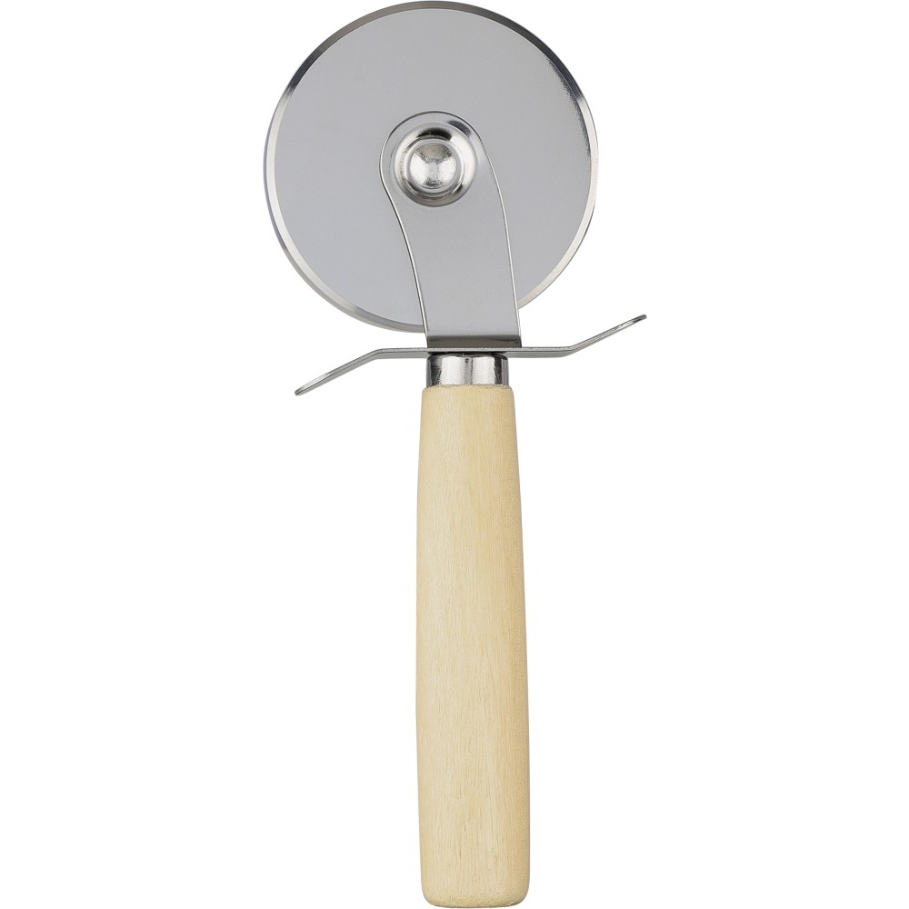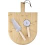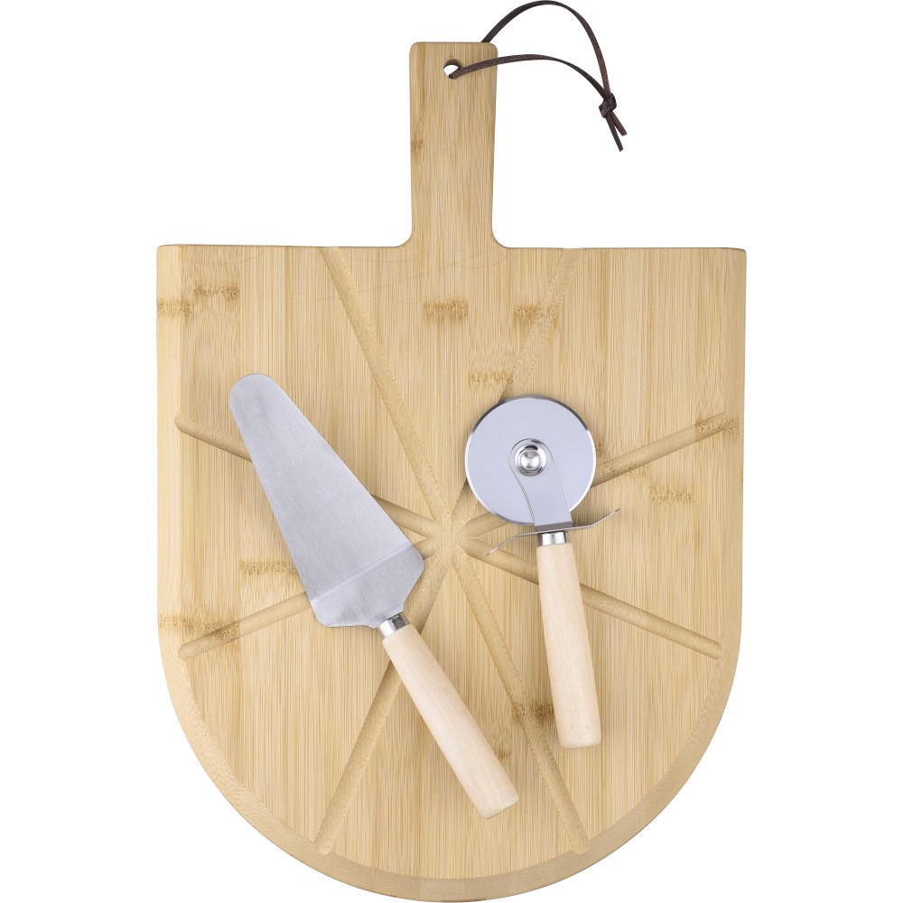 Bambusz pizzavágó deszka nyéllel és a szeletelést könnyítő barázdákkal. A készlet része egy rozsdamentes acélból és bükkfából készült pizzavágó és szervírozólapát is. A deszka nyelén PU akasztószalag található. Csomagolása barna papírdoboz.