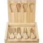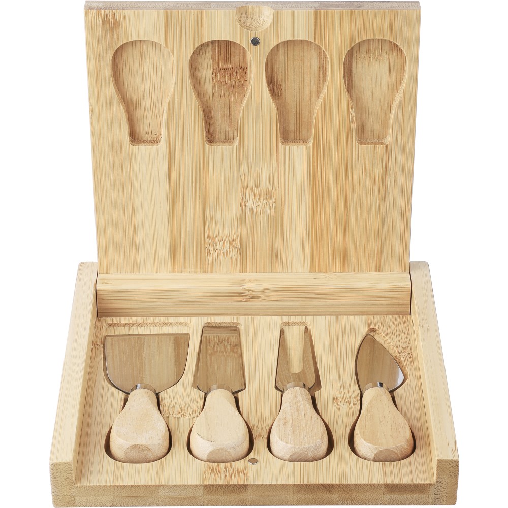 Bambusz sajtvágó deszka kihajtható fedéllel és 4 db, bükkfa nyéllel rendelkező rozsdamentes acél eszközzel. A dobozban kényelmesen elhelyezhető minden sajtkés. Csomagolása barna papírdoboz.