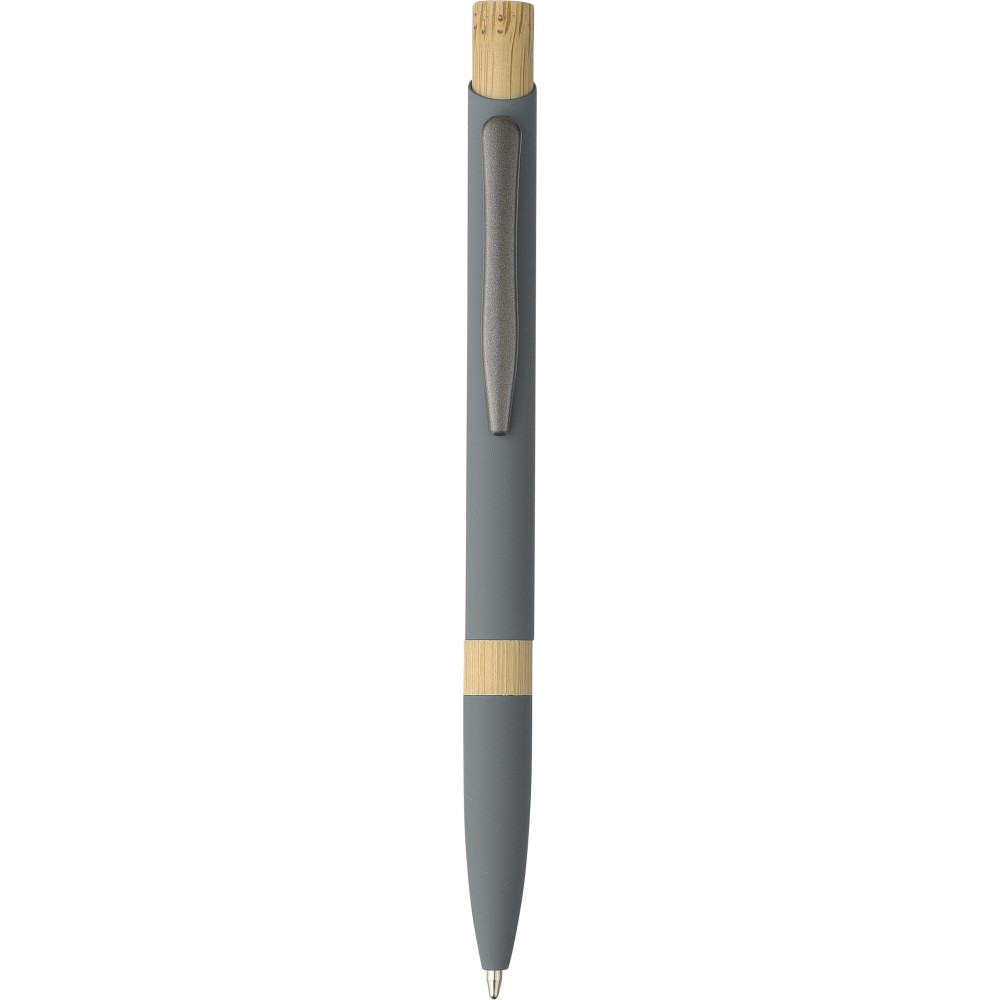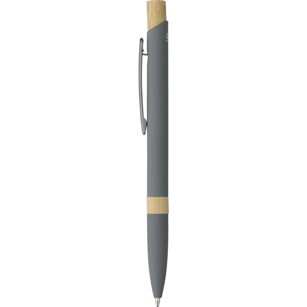 Golyóstoll újrahasznosított alumíniumból, gumírozott bevonattal, bambusz nyomógombbal és bambusz gyűrűvel a tolltesten. Kék tollbetéttel. A tollhegy vastagsága 1.0 mm, íráshossz: kb. 800 méter. Az újrahasznosított anyagra utaló logó a tollra van gravírozva.