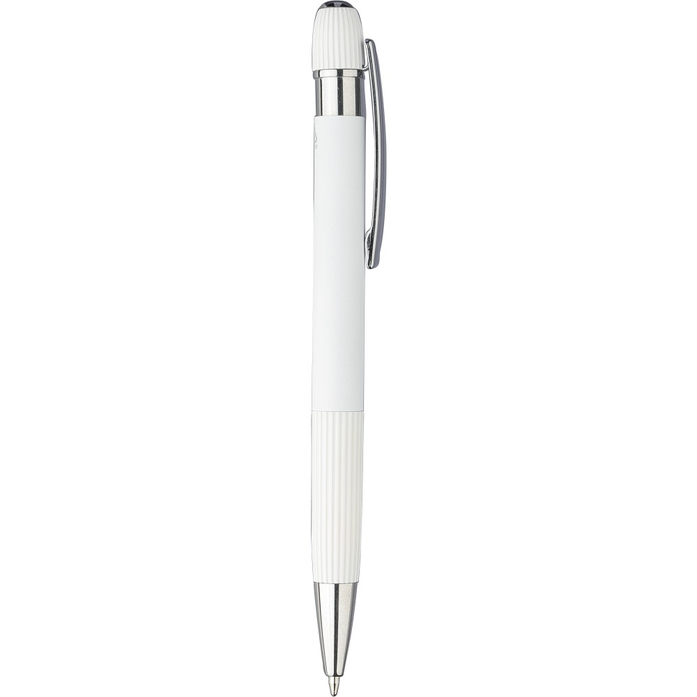 Újrahasznosított alumínium golyóstoll gumírozott felülettel. Bordázott részletekkel a markolaton és a tetején, krómozott műanyag heggyel és fém klipsszel ellátott nyomógombbal. Lézergravírozott újrahasznosított logóval. Kék tintával.