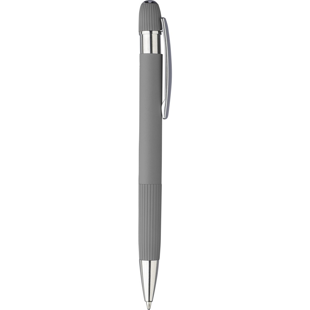 Újrahasznosított alumínium golyóstoll gumírozott felülettel. Bordázott részletekkel a markolaton és a tetején, krómozott műanyag heggyel és fém klipsszel ellátott nyomógombbal. Lézergravírozott újrahasznosított logóval. Kék tintával.