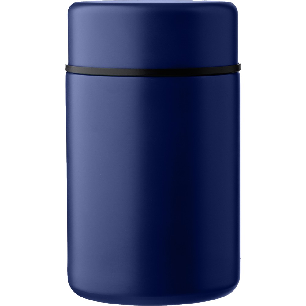Rozsdamentes acél, duplafalú ételtartó (460 ml) fekete PP kanállal és a tartó színével megegyező szilikon markolattal, belső része 304-es, külső része 201-es rozsdamentes acél, PP fedéllel kerül szállításra, darabonként barna kartondobozba csomagolva.