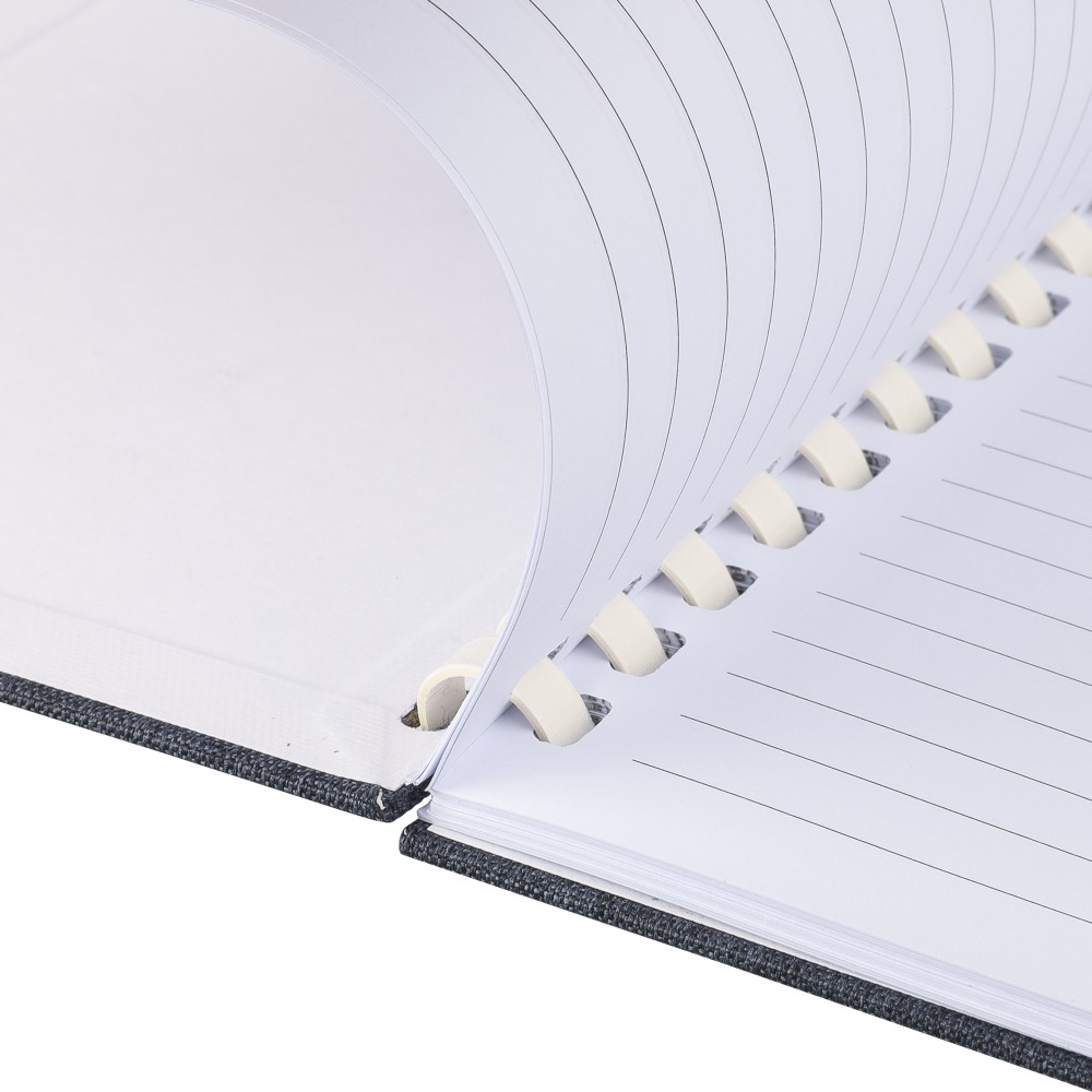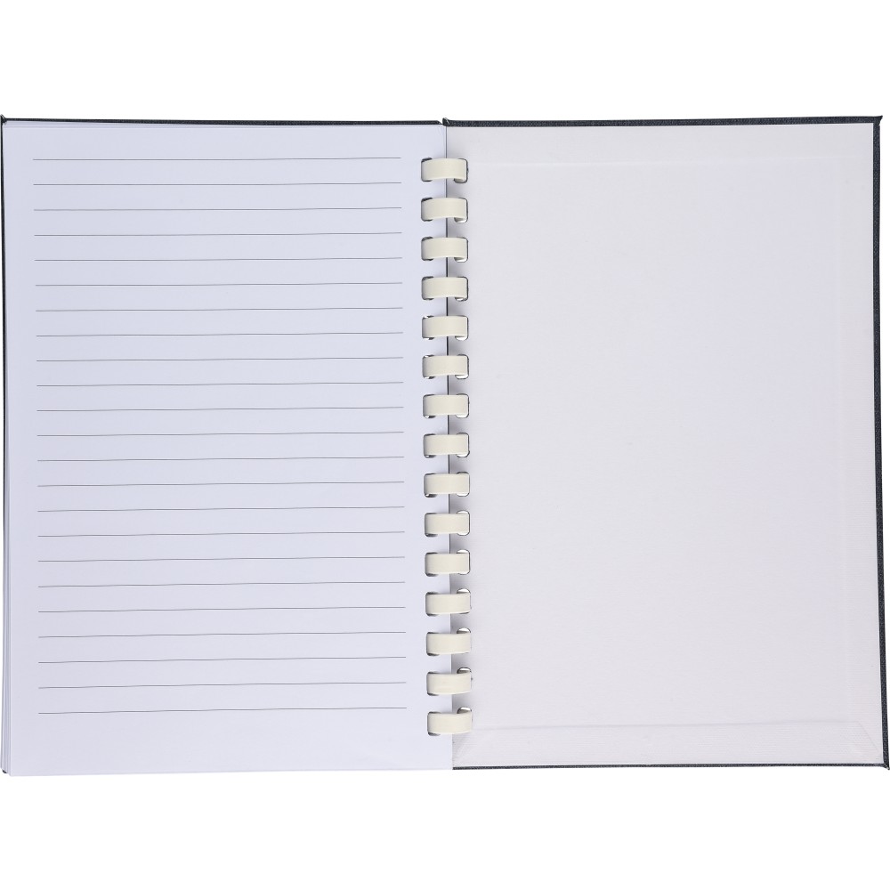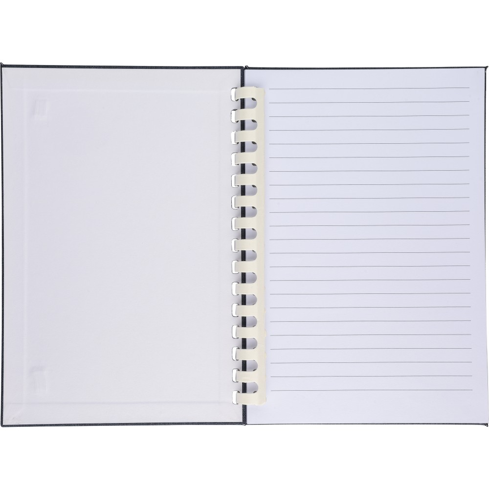 rPET jegyzetfüzet, kb. A5-ös méretű, 80 lapos. Kemény borítóval és rugalmas zárópánttal. Fehér karton spirállal (15 karikás), szalagos könyvjelzővel és 70 g/m2-es vonalas papírral. A hátoldalon rPET logóval. Selyempapírba csomagolva, nejlonzacskó nélkül.