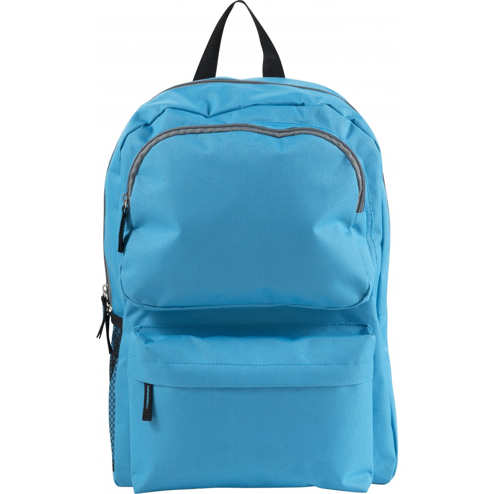Hátizsák több különböző tároló résszel, cipzáros első zsebbel, párnázott, állítható vállpánttal. 600D poliészter.