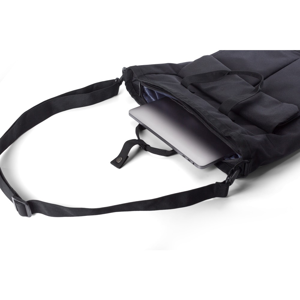 Poliészter (900D) válltáska. Két tépőzáras zseb az elülső oldalon, egy nagy cipzáras rekesz a tetején és egy cipzáras rekesz a hátoldalon. Több rekesz belül, köztük egy laptop rekesz (15 colos). A táska állítható pántokkal és rövid fogóval rendelkezik.