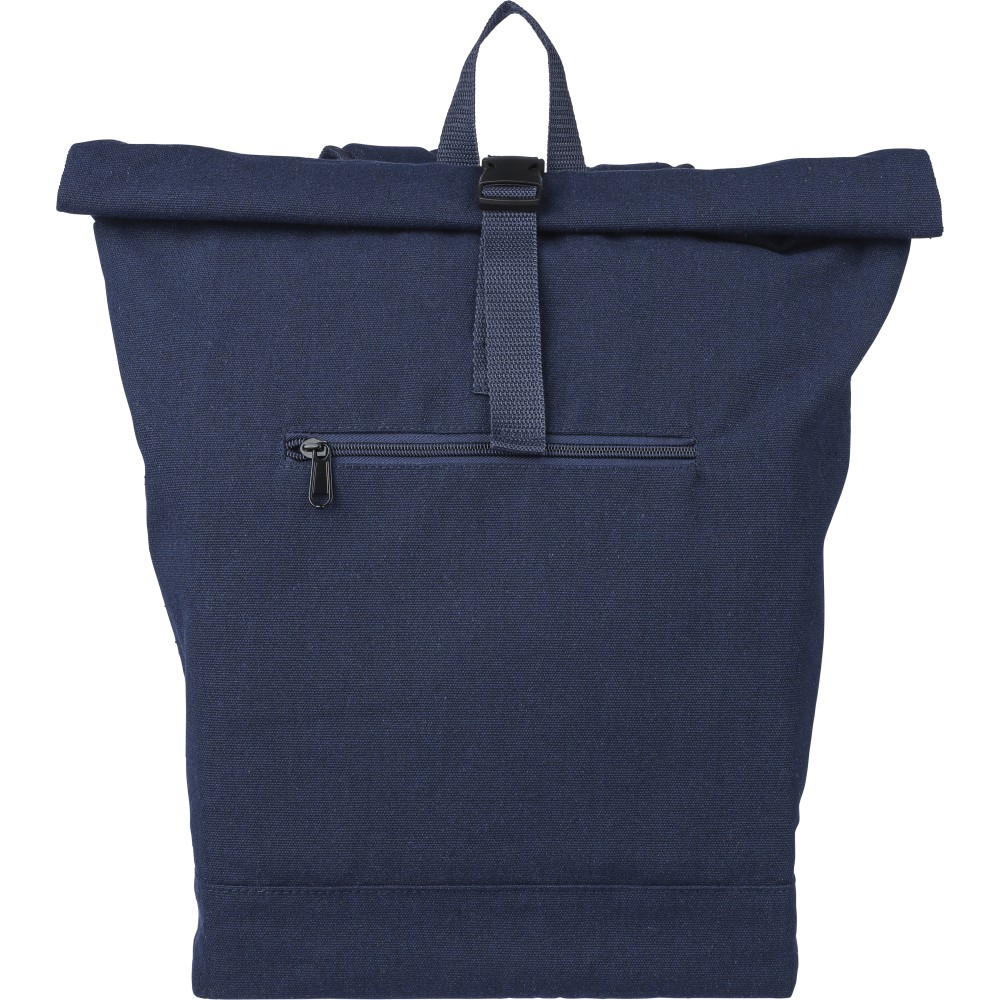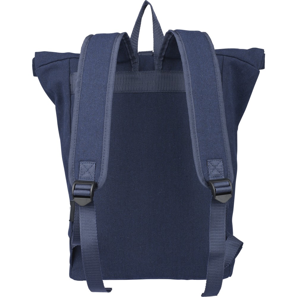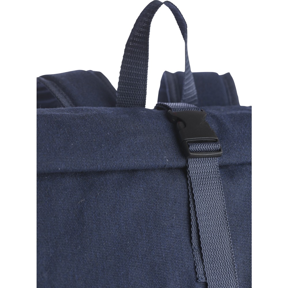 Rolltop hátizsák 330 g/m2 újahasznosított policotton anyagból, 210D poliészter béléssel és műanyag csattal. 15 literes űrtartalommal, egy nagy cipzáras rekesszel, 15"-es laptoptartó résszel, két belső és egy külső rekesszel. Tetején hordozófüllel, párnázott, állítható vállpánttal és egy kicsi, cipzáras elsőzsebbel. Teherbíró képessége 14 kg. Címkét tartalmaz.