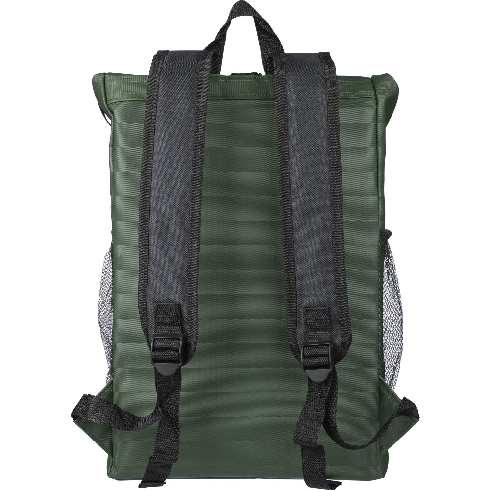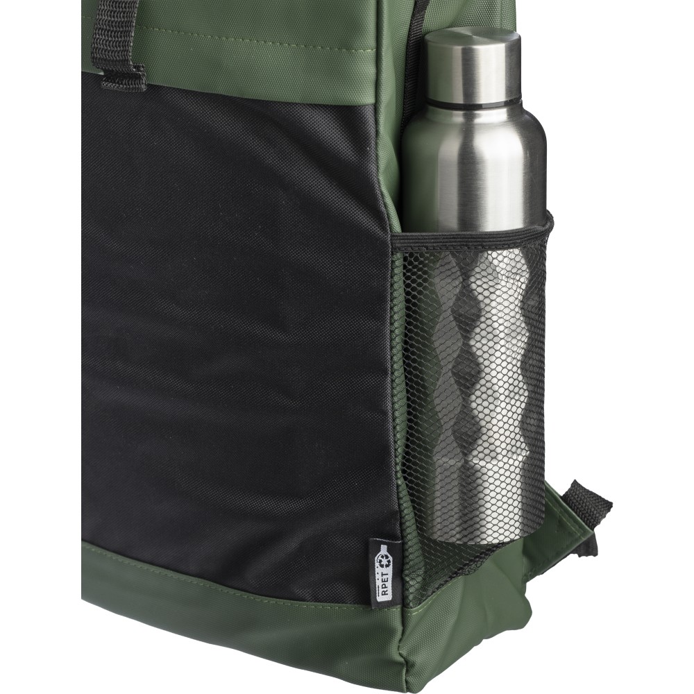 600D rPET poliészter roll-top hátizsák. PU bevonat teszi vízlepergetővé. Rejtett cipzáras első zsebbel, hálós oldalzsebekkel, 15 -es laptop számára kialakított tárolórésszel, 5 tárolórekesszel, állítható vállpánttal. Kapacitása 25 liter, teherbírása 15 kg. Oldalán rPET címkével.