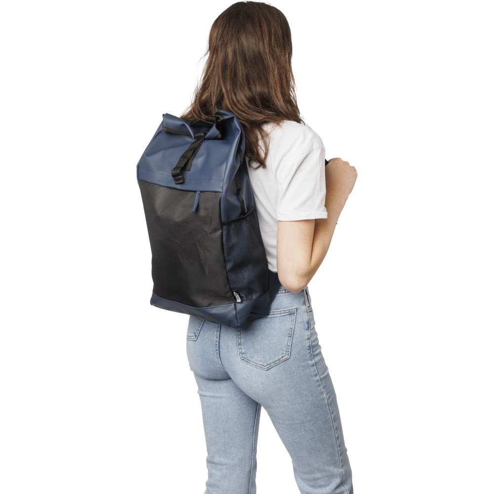 600D rPET poliészter roll-top hátizsák. PU bevonat teszi vízlepergetővé. Rejtett cipzáras első zsebbel, hálós oldalzsebekkel, 15 -es laptop számára kialakított tárolórésszel, 5 tárolórekesszel, állítható vállpánttal. Kapacitása 25 liter, teherbírása 15 kg. Oldalán rPET címkével.