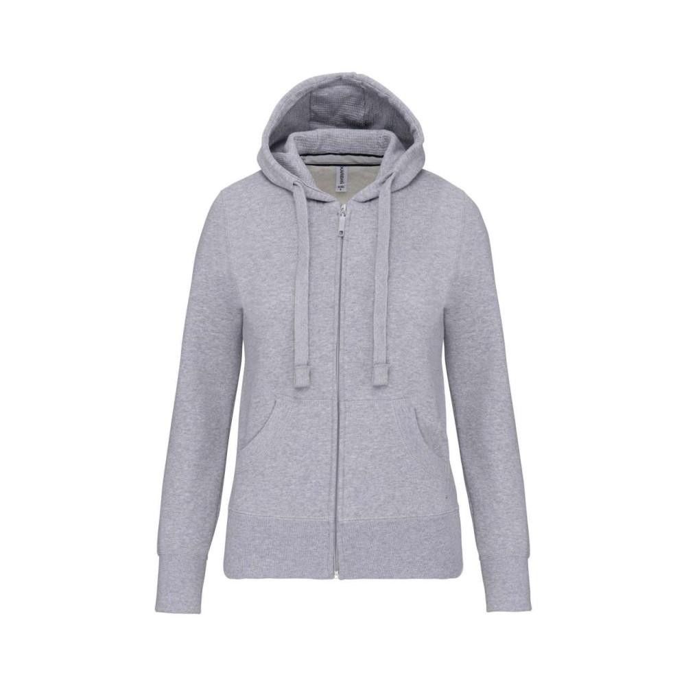 80% pamut és 20% poliészter. Belül bolyhos anyag, szürke színű szalagerősítés a nyakban, bélelt kapucni, kenguruzseb, bordás ujj- és derékpasszé, YKK cipzár. 300 g/m2. XS-2XL.
