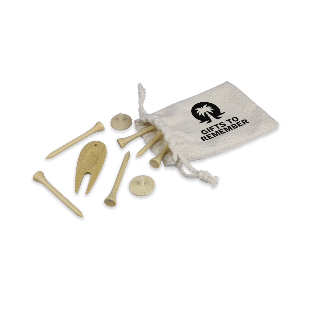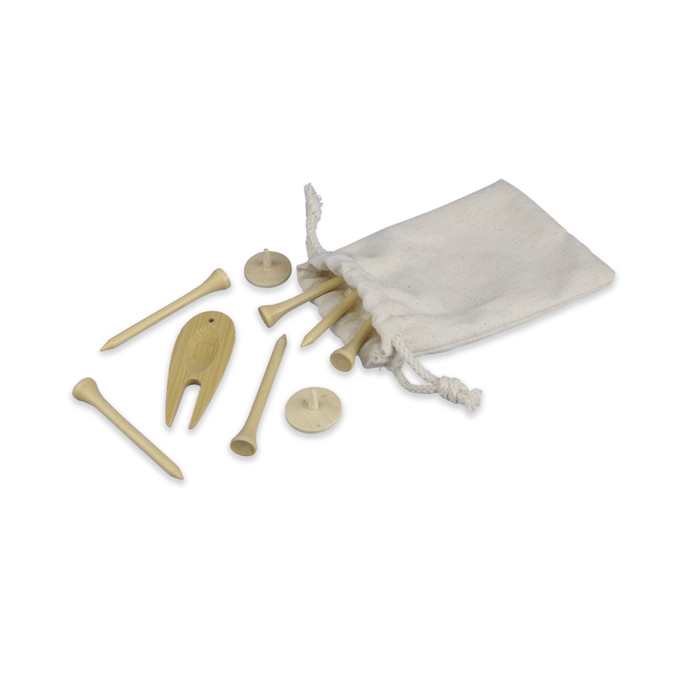 Fa golf tee készlet 6 db tee-vel, 1 db bambusz pitch-villával és db fa jelölővel. Vászontasakba csomagolva.