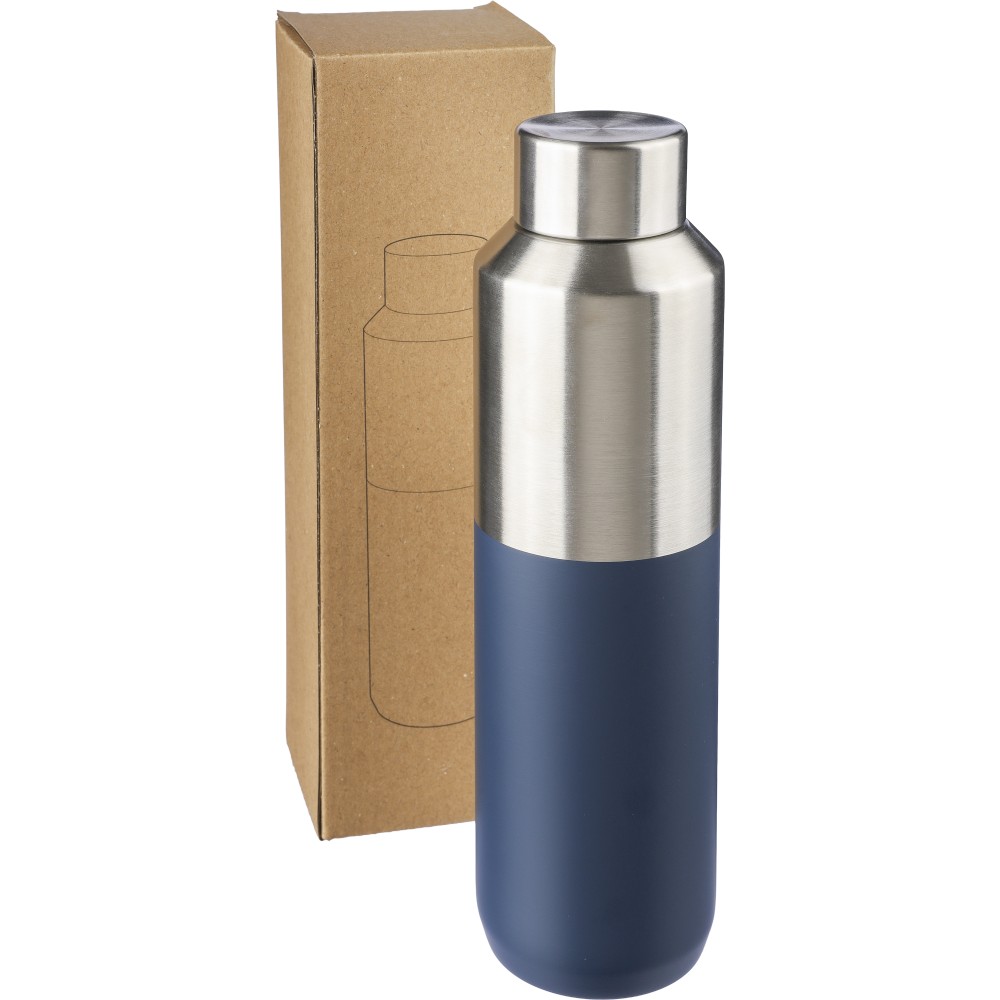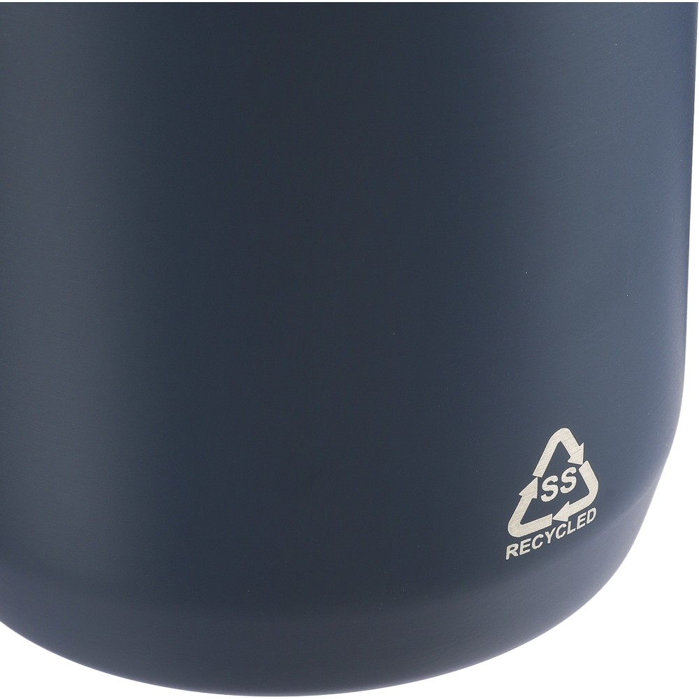Újrahasznosított rozsdamentes acél palack, 600 ml. Duplafalú, vákuumszigetelt, a belső 304-es, a külső pedig 201-es rozsdamentes acélból készült. Kupakja PP, 201-es rozsdamentes acél külsővel. Elején gravírozott újrahasznosított logó található. Csomagolása barna papírdoboz.