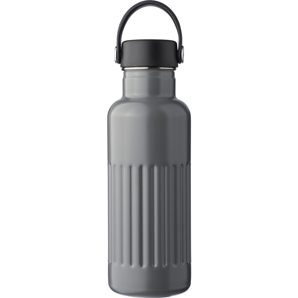Újrahasznosított rozsdamentes acél termosz, 500 ml. A belső 304-es, a külső 201-es rozsdamentes acélból készült, bordás markolattal, PP és fém fedéllel, műanyag hordozófüllel. Gravírozott újrahasznosított logó található a terméken. Csomagolása barna papírdoboz.
