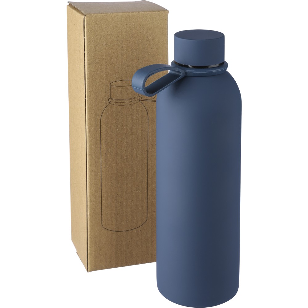 Újrahasznosított rozsdamentes acélból készült duplafalú vákuumpalack, 500 ml-es. 304-es rozsdamentes acél belsővel és 201-es rozsdamentes acél külsővel. Gumírozott felülettel, fém díszítésű csavaros PP kupakkal és szilikon hordfüllel. Gravírozott, újrahasznosított logóval. Csomagolása barna papírdoboz.