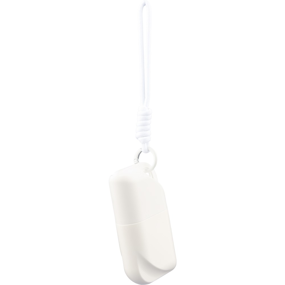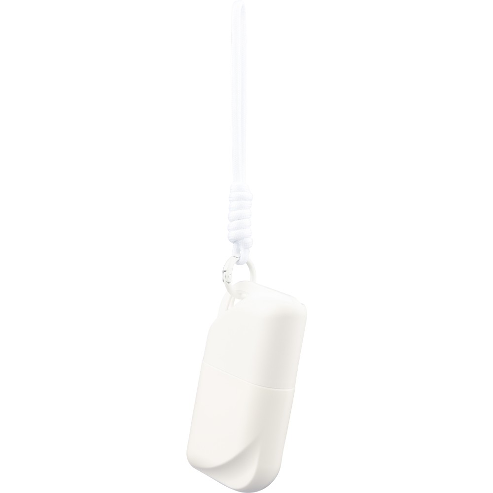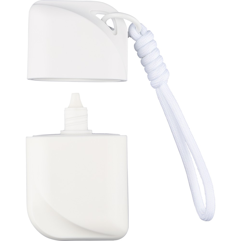 SPF 50 faktorszámú naptej a tartó színével megegyező poliészter csuklópánttal és fém akasztóval. A hátoldalon az összetevőlista és a minőségmegőrzési idő szerepel. 50 ml.