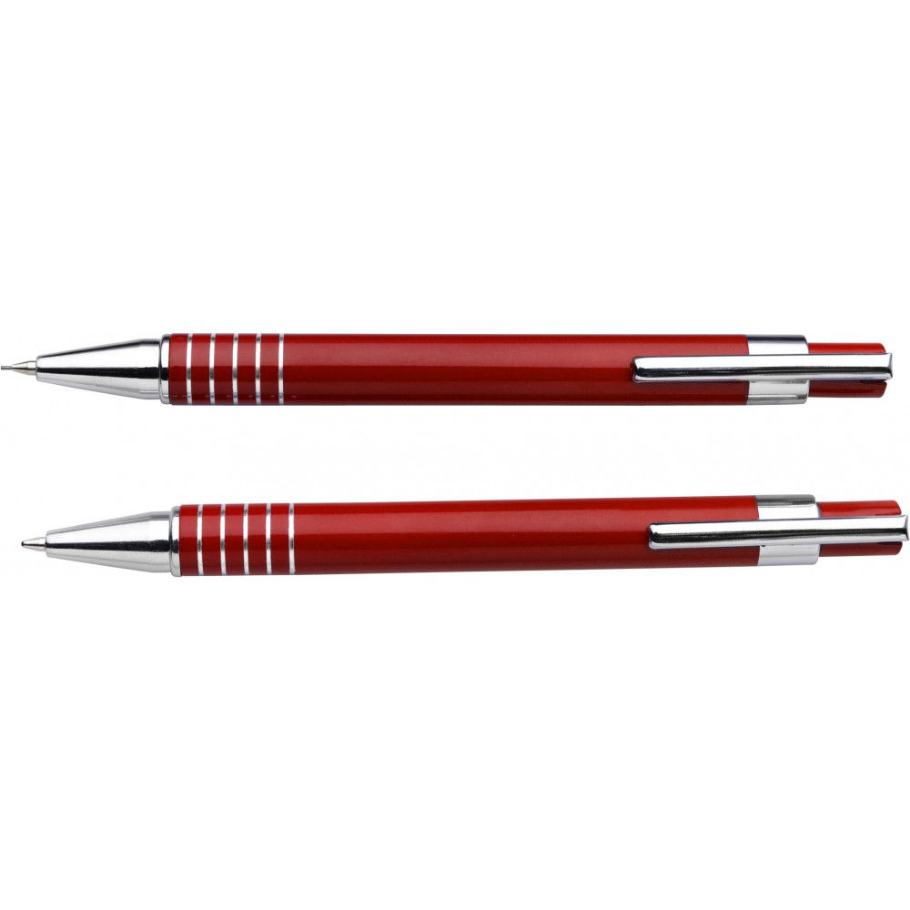 Lakkozott felületű golyóstoll fekete tollbetéttel és töltőceruza, színben hozzáillő dobozban.