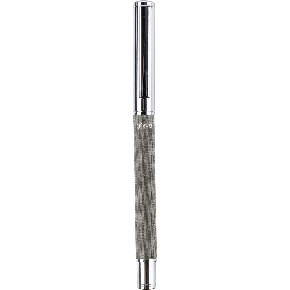 Sárgaréz és rPET golyóstoll fém klipsszel és markolattal. Csúszó mechanizmussal és rPET logóval a tolltesten. Egyenként csomagolva barna kartondobozban. Kék tollbetéttel.