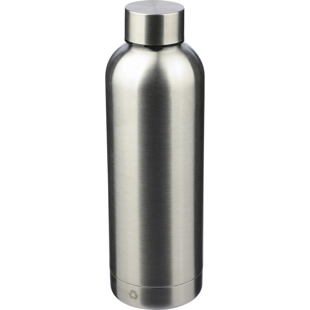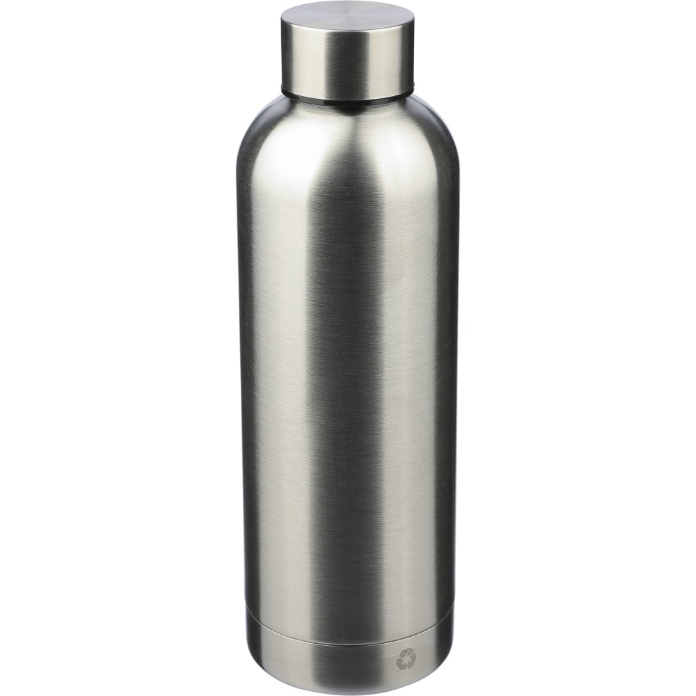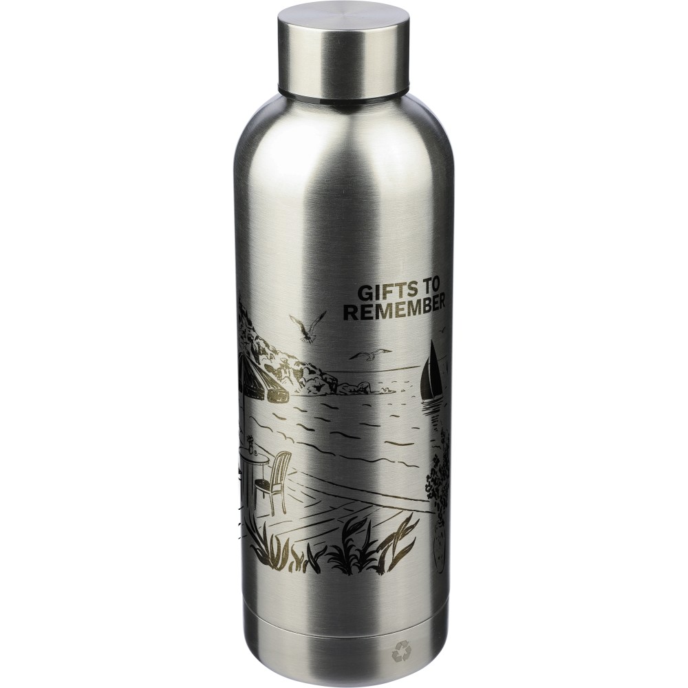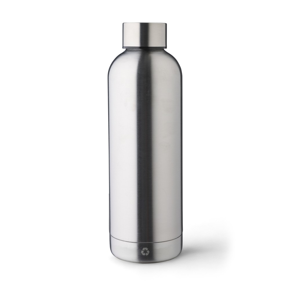 Újrahasznosított rozsdamentes acél (s/s304) duplafalú palack, matt felülettel. Barna kartondobozba egyedileg csomagolva. Űrtartalom: 500 ml.